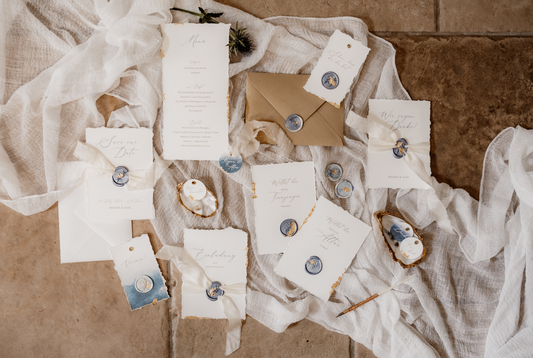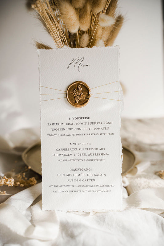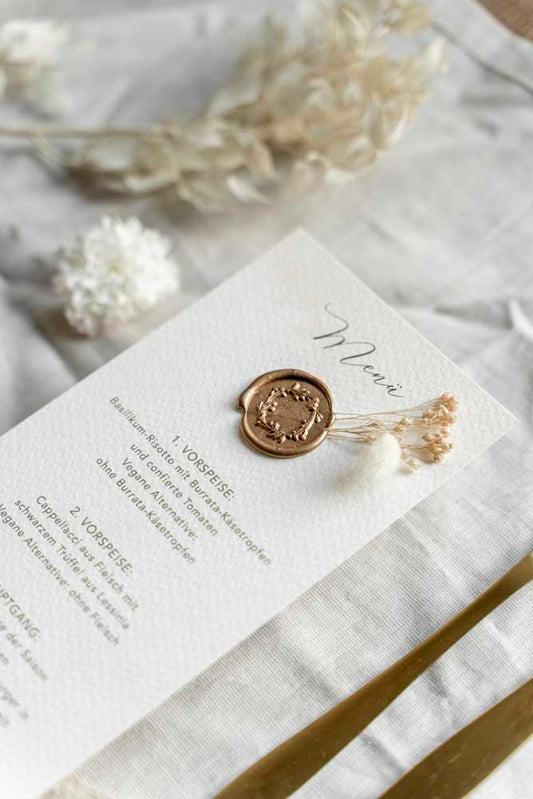 Sucht euch euer gewünschtes Design der Karte aus und bestellt die Menge an Karten, die ihr für eure Hochzeit benötigt. Als nächstes sendet ihr uns eine Mail (Mail @ Freuden-traenen.de) mit euren Textwünschen und Anpassungen, die ihr vornehmen möchtet. Zum Beispiel könnt ihr auch eine andere Wachssiegelfarbe und ein anderes Motiv für das Wachssiegel aussuchen, andere Farben beim Seidenband auswählen oder die Schriftfarbe an euer Konzept anpassen lassen.